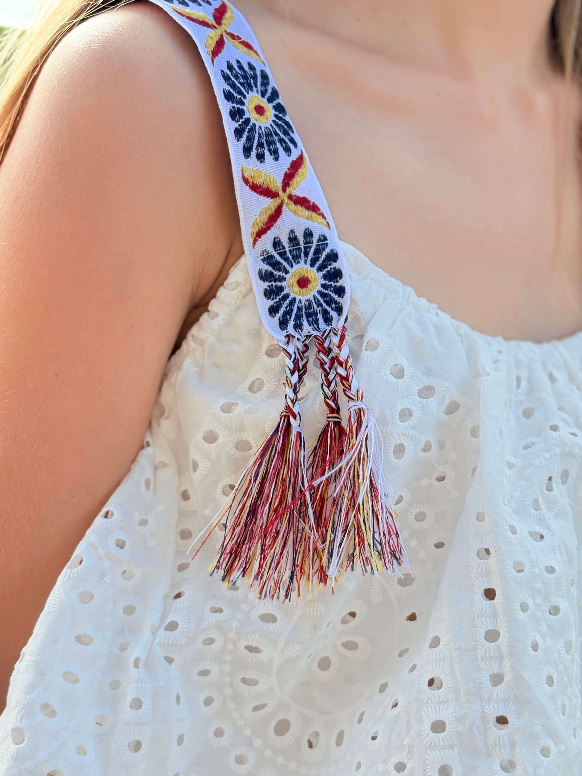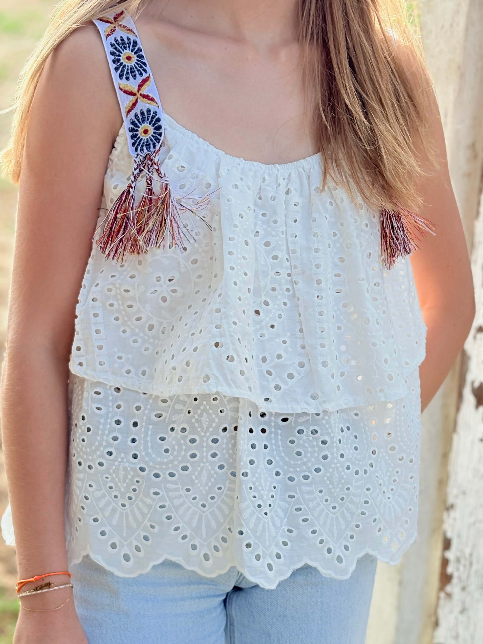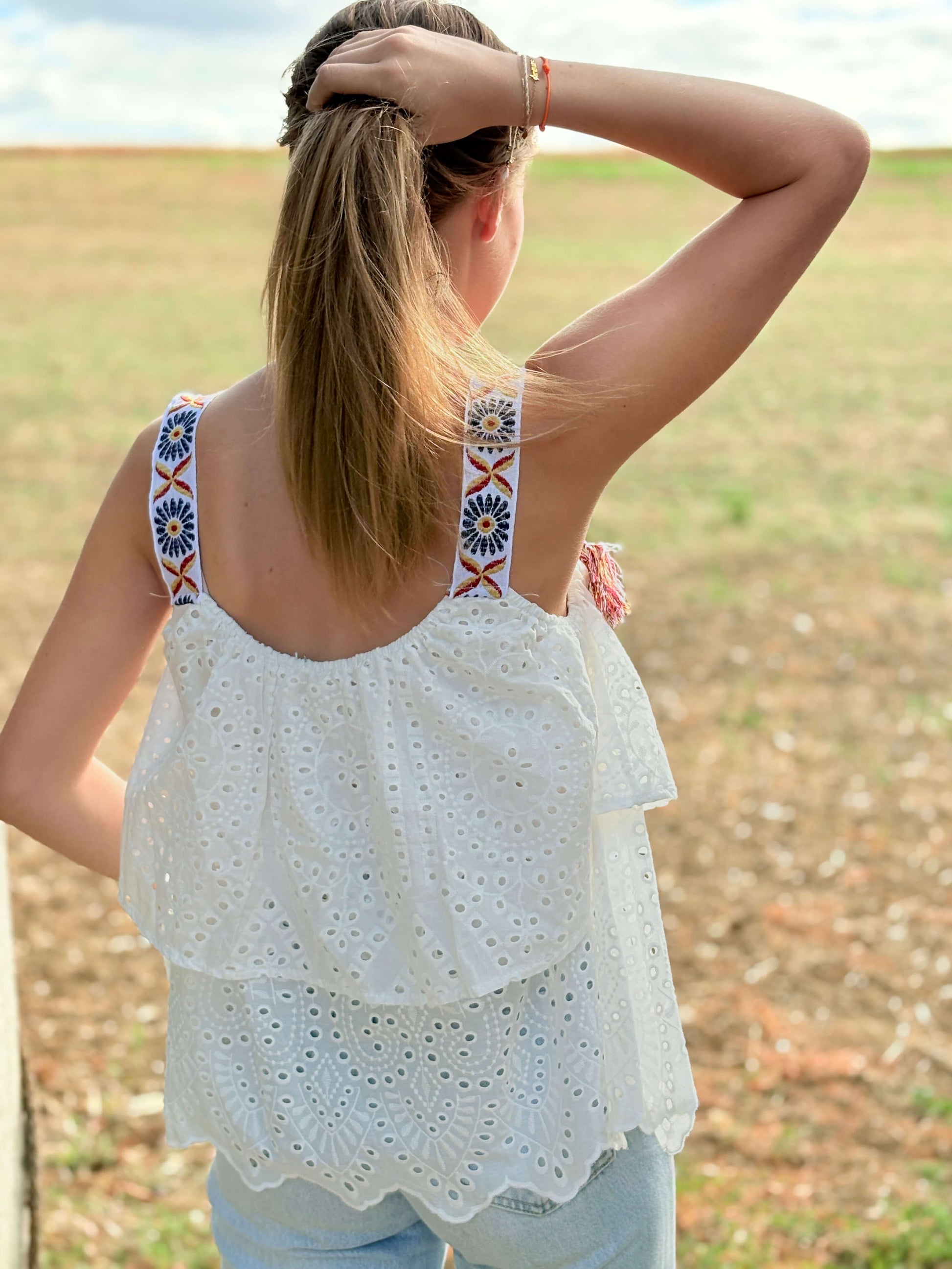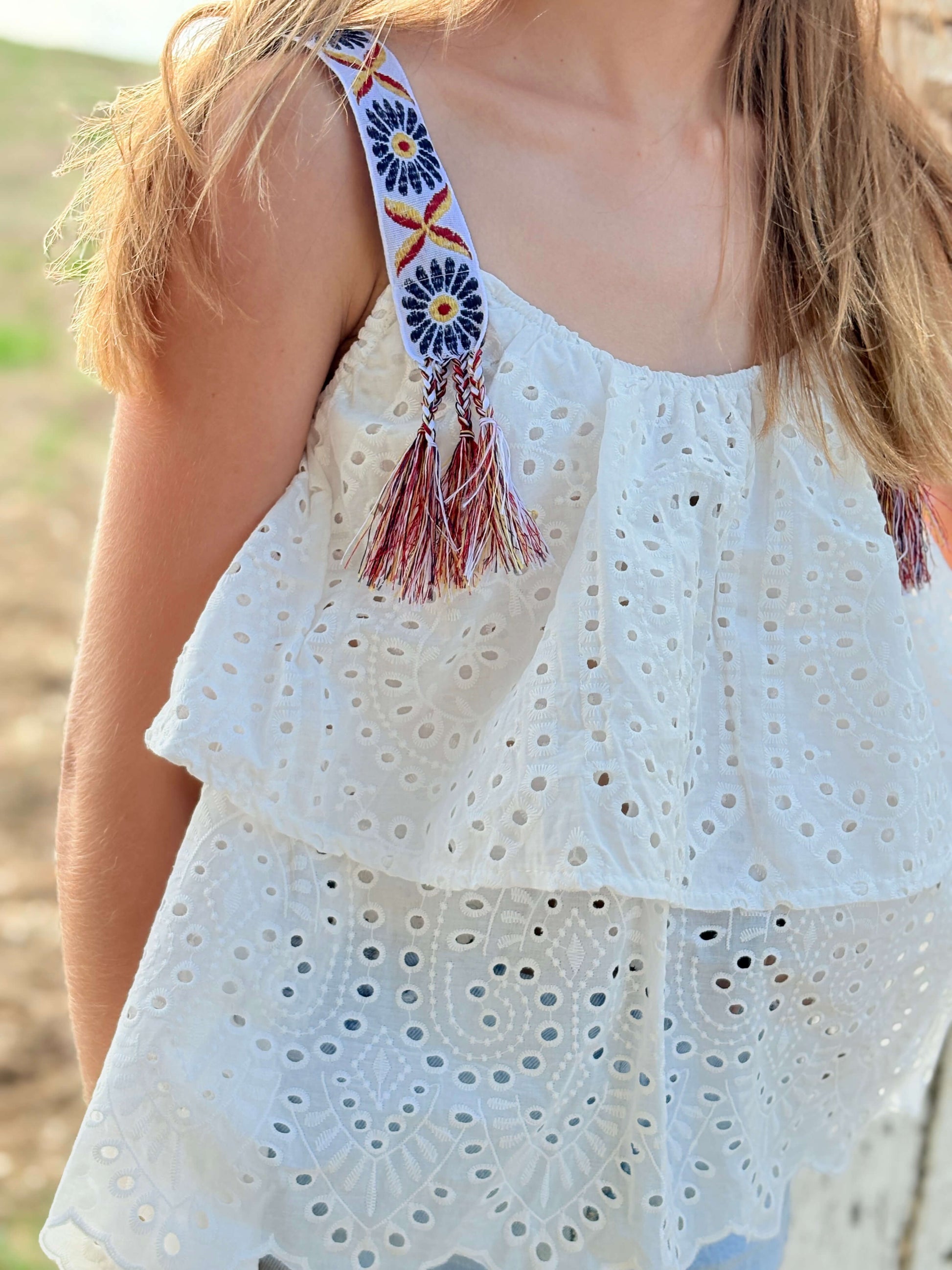 Laissez-vous séduire par ce débardeur blanc au charme artisanal, un indispensable de l'été qui allie douceur et caractère. Sa matière effet broderie apporte une texture délicate et élégante, tandis que ses bretelles se parent d'un motif aztèque vibrant.